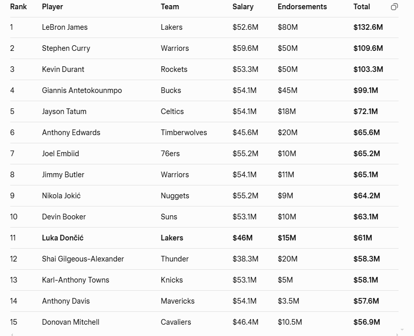 As the NBA's new $76B TV deal kicks in, expect these numbers to explode further. LeBron's already a billionaire; Luka's on the fast track.